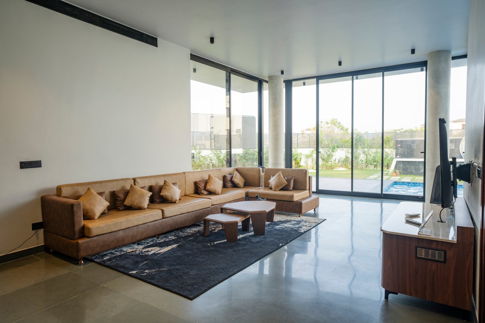 The ground floor living room offers a spacious and inviting atmosphere with centralised AC for complete comfort. Enjoy entertainment on a 55-inch TV while relaxing in a space designed to provide stunning panoramic views, making it the perfect place to unwind.